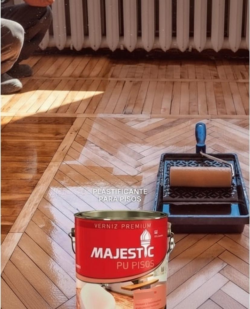 Majestic PU Pisos es un barniz poliuretanico para pisos y escaleras de madera. Su formula de alta calidad sella, protege y proporciona una apariencia vitrificada realzando la belleza natural de la madera. Indicado exclusivamente para interiores, Majestic PU Pisos puede ser aplicado sobre madera nueva o antigua. Es resistente a la abrasión de los habituales productos de limpieza. Puede ser utilizado en bancos, brandas, etc.