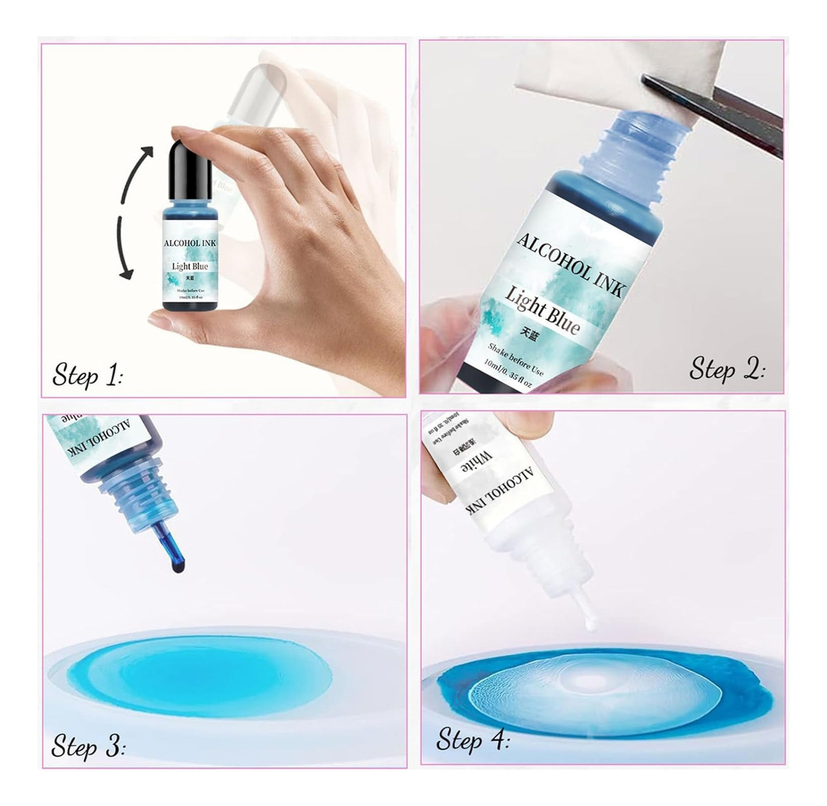 Cada botella de 10 ml de este juego cuenta con tintas altamente pigmentadas y de secado rápido que proporcionan efectos de mármol en una variedad de superficies, incluyendo papel brillante, metal y vidrio.