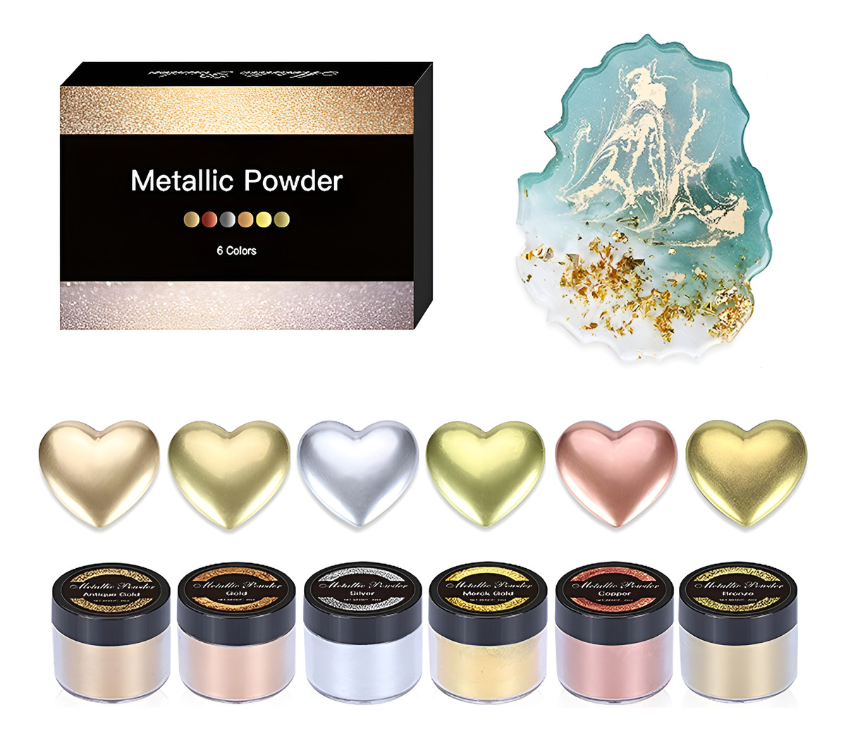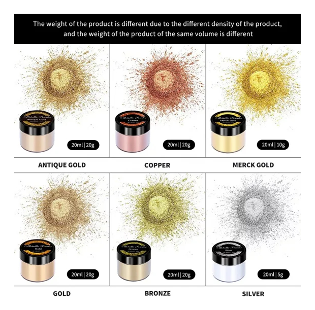 Increíbles tonos metálicos: polvo de mica metálica que se almacena en un práctico recipiente resellable de grado alimenticio. Incluye 4 tonos metálicos llamativos: Oro/Plata/Oro Vintage/Bronce.