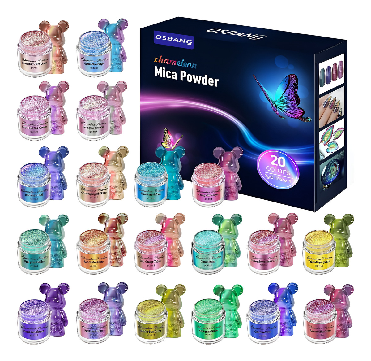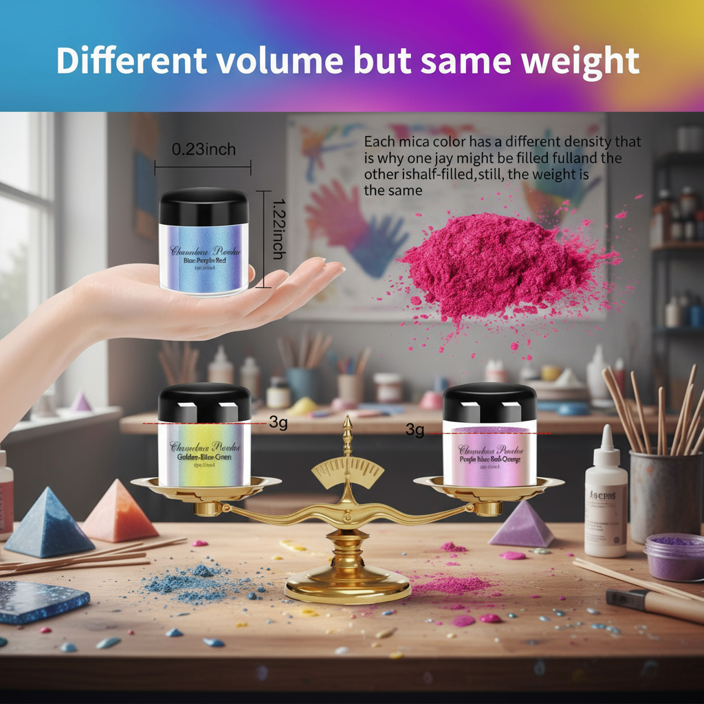 20 colores: más opciones: polvo de mica camaleón premium, 0.1 oz cada frasco, el peso total de 20 tarros es de 2.12 oz/2 onzas. Cambios de color fuertes dependiendo del ángulo de visión (Nota: diferente volumen debido a la densidad del polvo, pero tiene el mismo peso)
