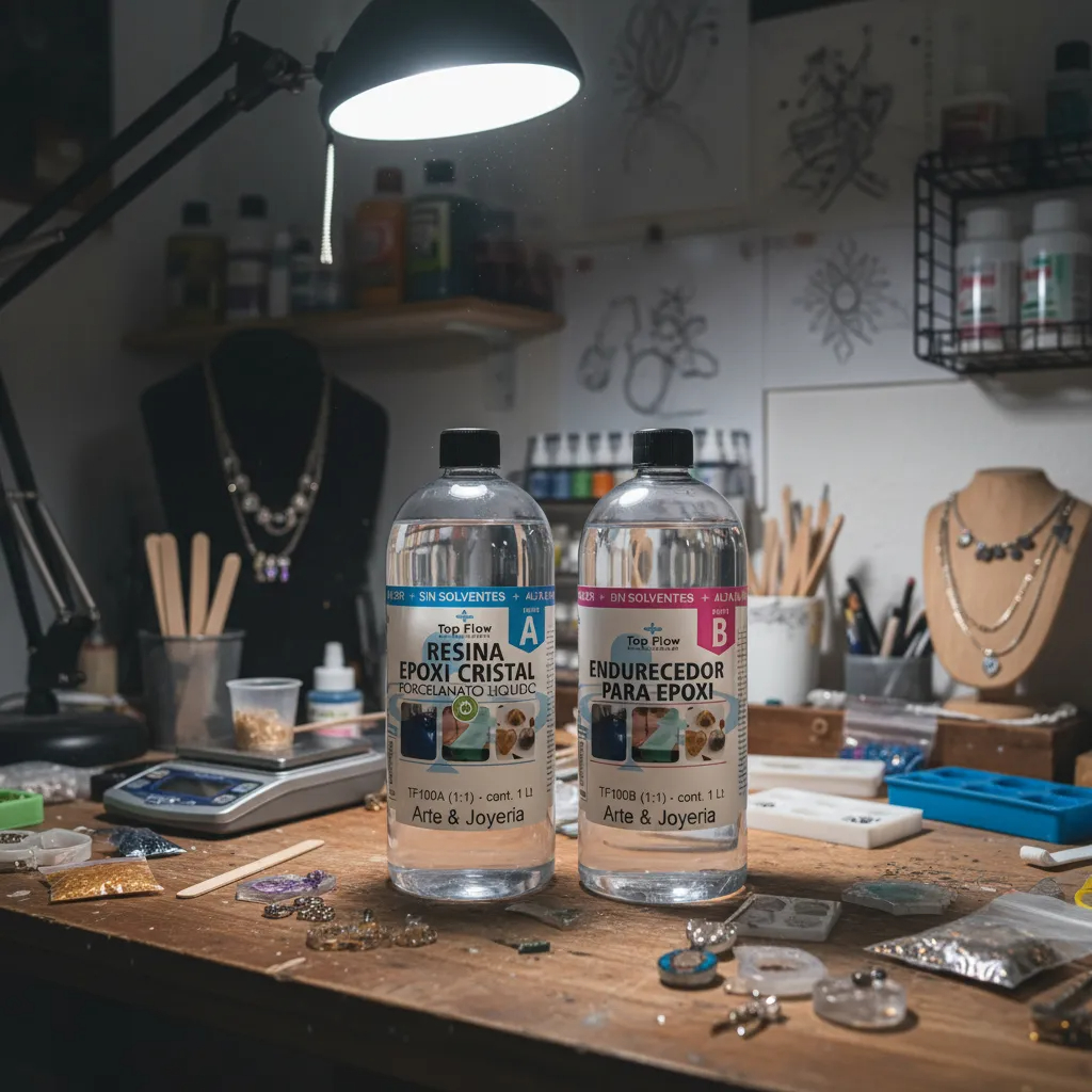 TF100 es el sistema de Resina Epoxi de Top Flow desarrollado para Arte & Joyería, tiene un buen curado a temperatura ambiente, su relación de mezcla es 1:1 haciéndola muy fácil de manejar. Además su baja viscosidad y buena fluidez lo hace ideal para relleno de moldes pequeños y medios de silicona. Es totalmente traslucida, no se deforma y no amarillea.