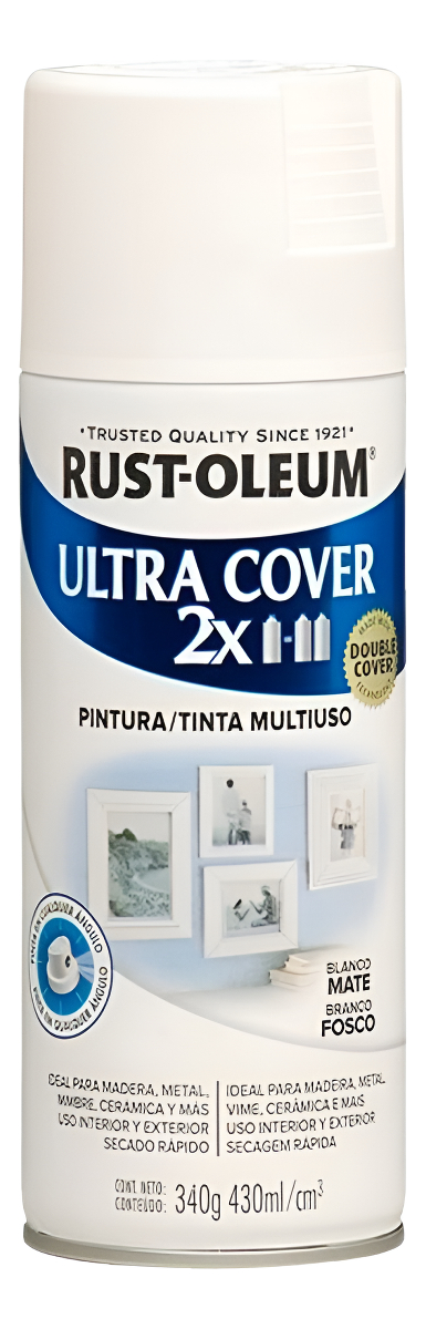 Pintura en aerosol ultra cubritiva para aplicar sobre madera, metal, plástico, mimbre, vidrio, melamina.
